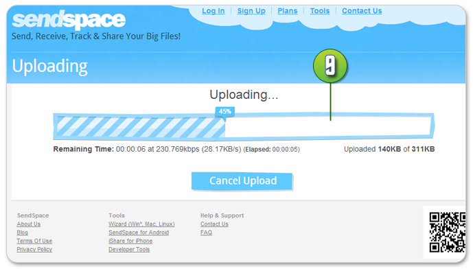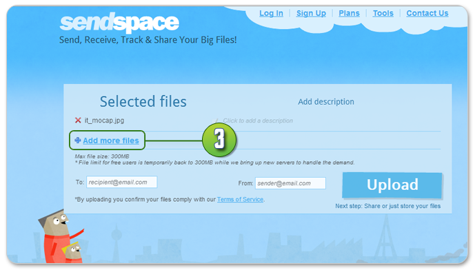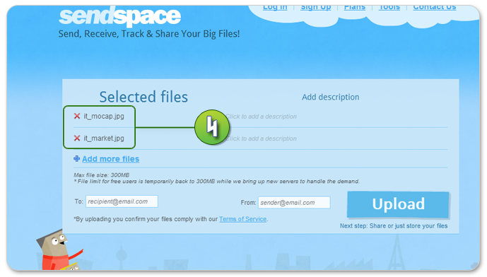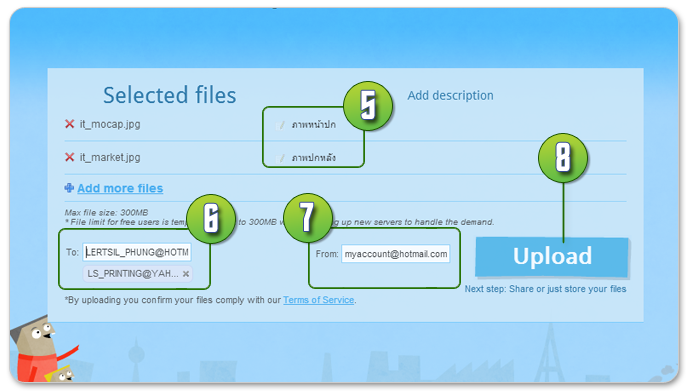 • ในกรณีที่ไฟล์งานมีขนาดใหญ่เกิน 20 MB คุณสามารถอัพโหลดไฟล์งานได้จากผู้ให้บริการฝากไฟล์ฟรี เช่น www.mediafire.com, www.sendspace.com โดยทางโรงพิมพ์ ขอแนะนำเว็บไซต์ www.sendspace.com ในการฝากไฟล์ ที่มีขนาดใหญ่ไม่เกิน 300 MB ซึ่งคุณไม่จำเป็นต้องสมัครสมาชิกก็ได้ โดยมีขั้นตอนในการอัพโหลดงานดังนี้